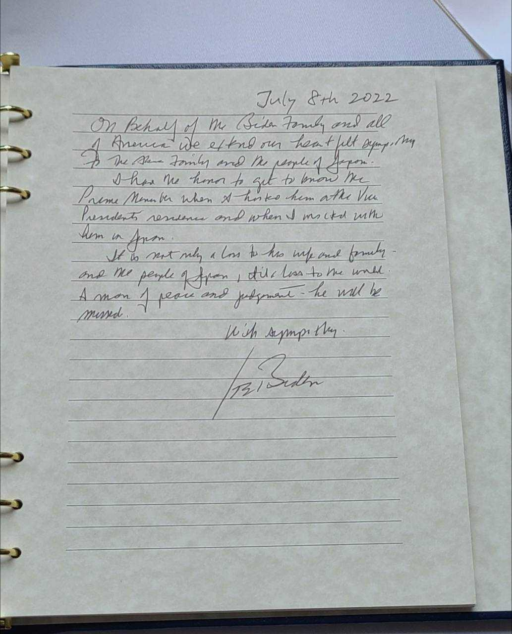 He writes a condolence letter (which looks sloppy) and signs it "Joe Biden".