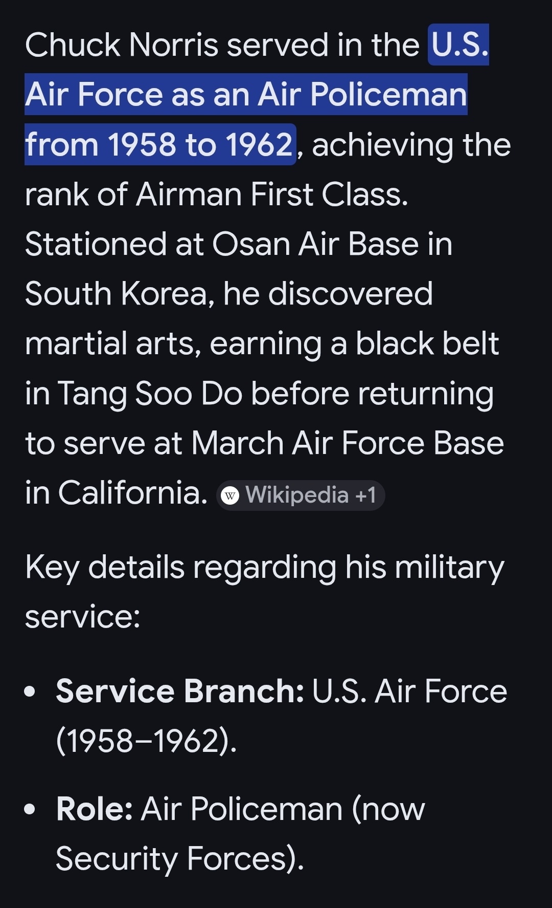 R.I.P. to Chuck Norris, A1C, (former) USAF, 1958-1962, Osan (South Korea) and March (California) AFBs. "Condolences to family and friends, kith and kin. Deep Peace and Blessings of Strength to all y'all there and now " V/r, R.A. "Rick" Briggs, Jr., CPT, USA, Retired. Killeen, Texas.