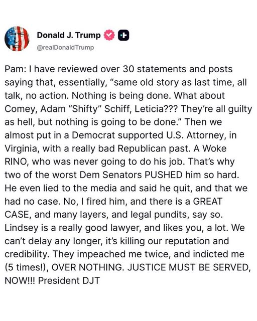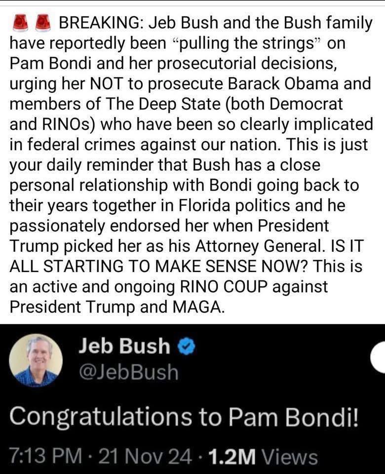 Have to get rid of Bondi. She’s a Rino Bush plant. She was selected to slow roll the Trump agenda with empty promises. Get Matt Gaetz in there.