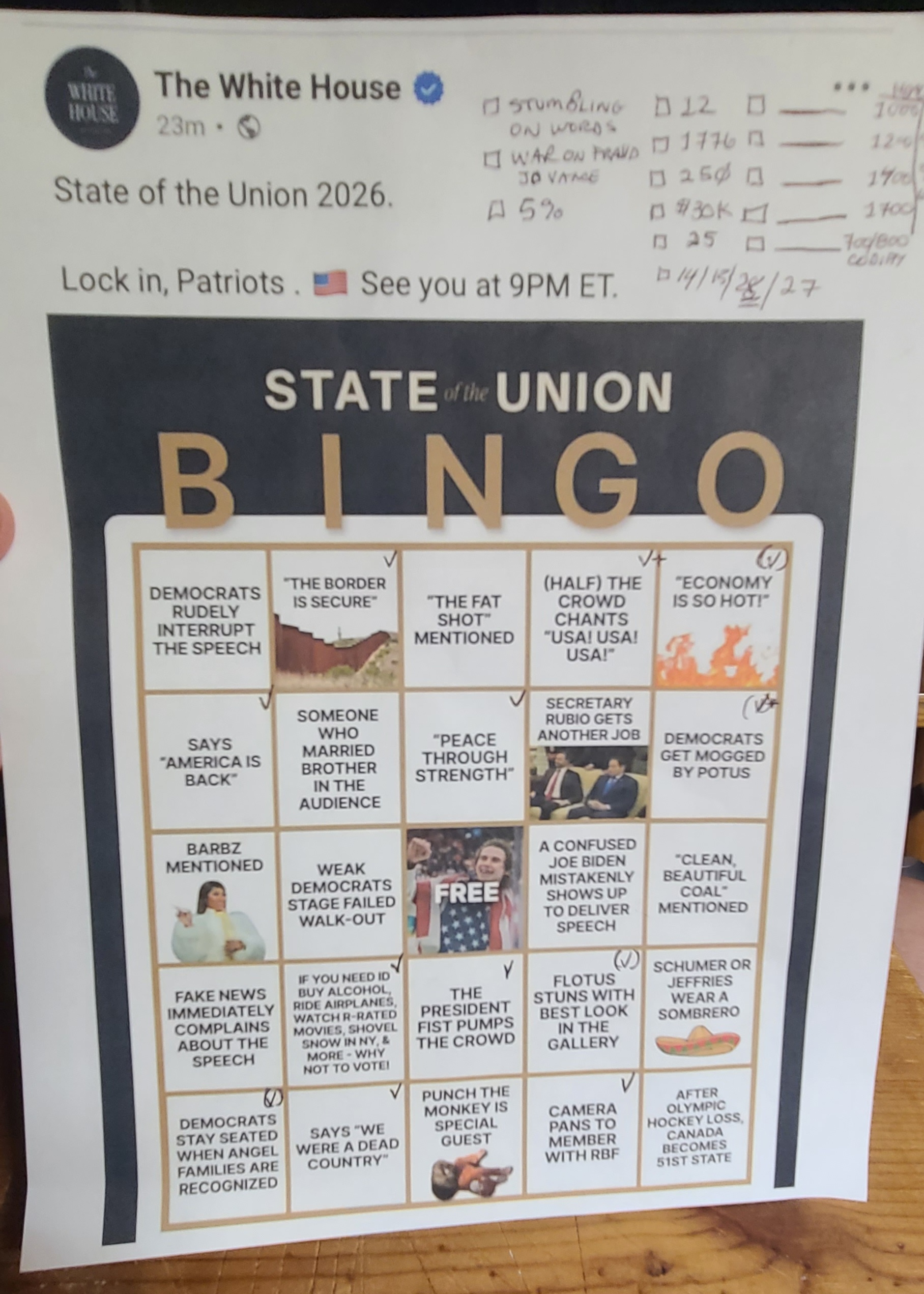 It was an awesome and, at times, deeply emotional SOTU 2026. Salute to the BOSS MAN Beast Mode. My SOTU BINGO card runneth over! Lol. I missed a few moments-- caught most of the SURFER bits. Okay, Ohana Surfer Patriots.... Rest. Beau's already in 💤 mode in his #1 Craic bed.