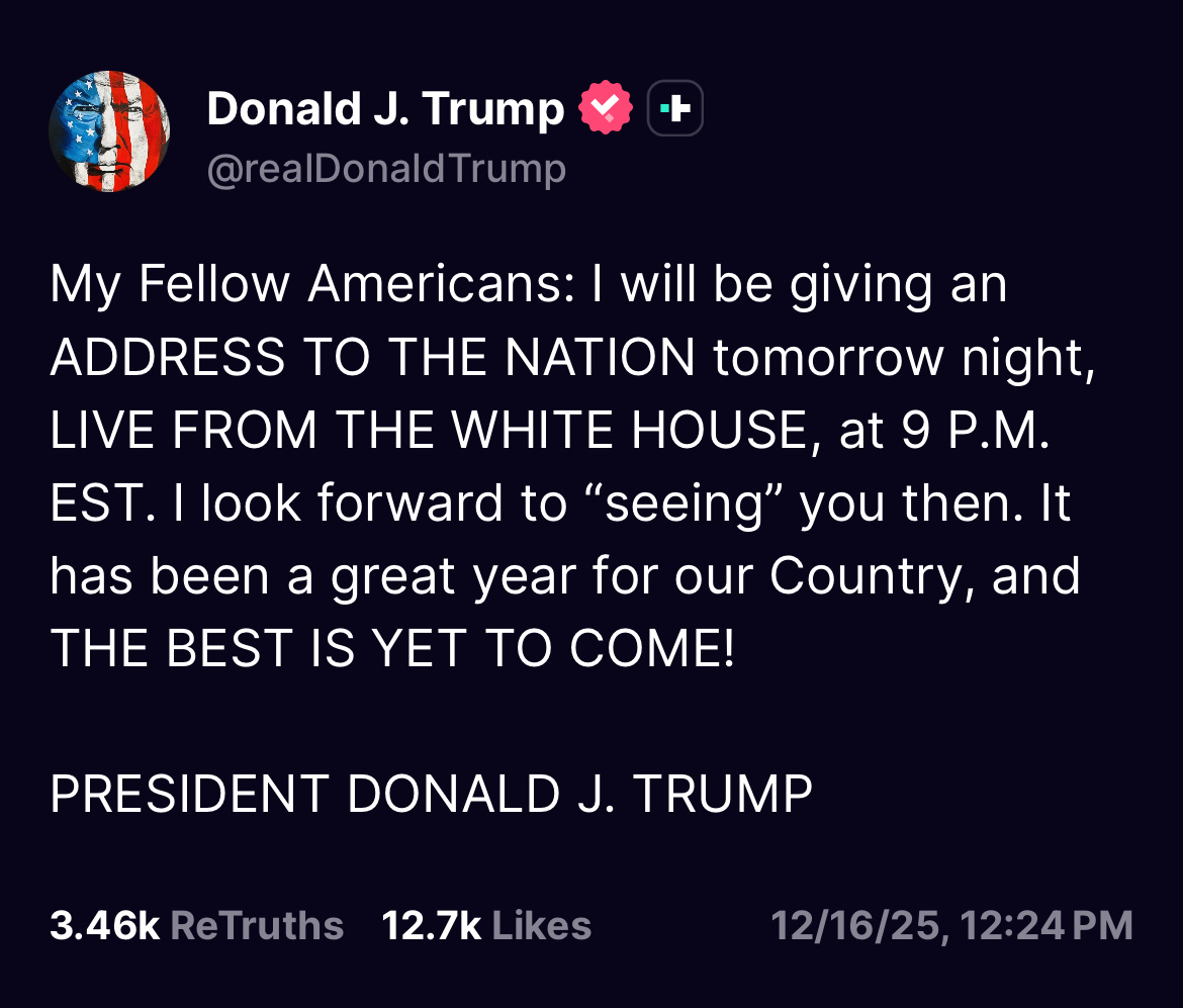 President Trump Addressing the Nation tomorrow (12/17/2025) at 9PM ET.