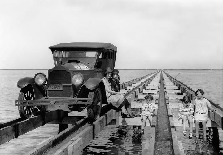 Here's a glorious photo of two women and three girls on the Don Patricio causeway in Corpus Christi, 1930. A sensational image. So sharp! I think I'd be a bit leery of driving across the water on this structure, but folks back then were apparently a bit more courageous. When Colonel Sam Robertson bought Pat Dunn's interests in Padre Island in 1925, he envisioned developing the Island into the Miami Beach of the Texas coast. In 1927 he built the first causeway from the island's northern end to Flour Bluff on the mainland. He named it the Don Patricio causeway in honor of Patrick Dunn.