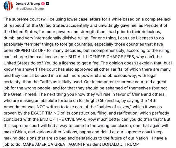 "The supreme court (will be using lower case letters for a while based on a complete lack of respect!) of the United States accidentally and unwittingly gave me, as President of the United States, far more powers and strength than I had prior to their ridiculous, dumb, and very internationally divisive ruling..."