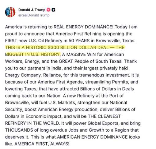 “For years, investors believed building a new refinery in the United States was impossible,” said Nick Ayers, a former Assistant to the President who is joining America First Refining. “What changed was leadership and policy.”