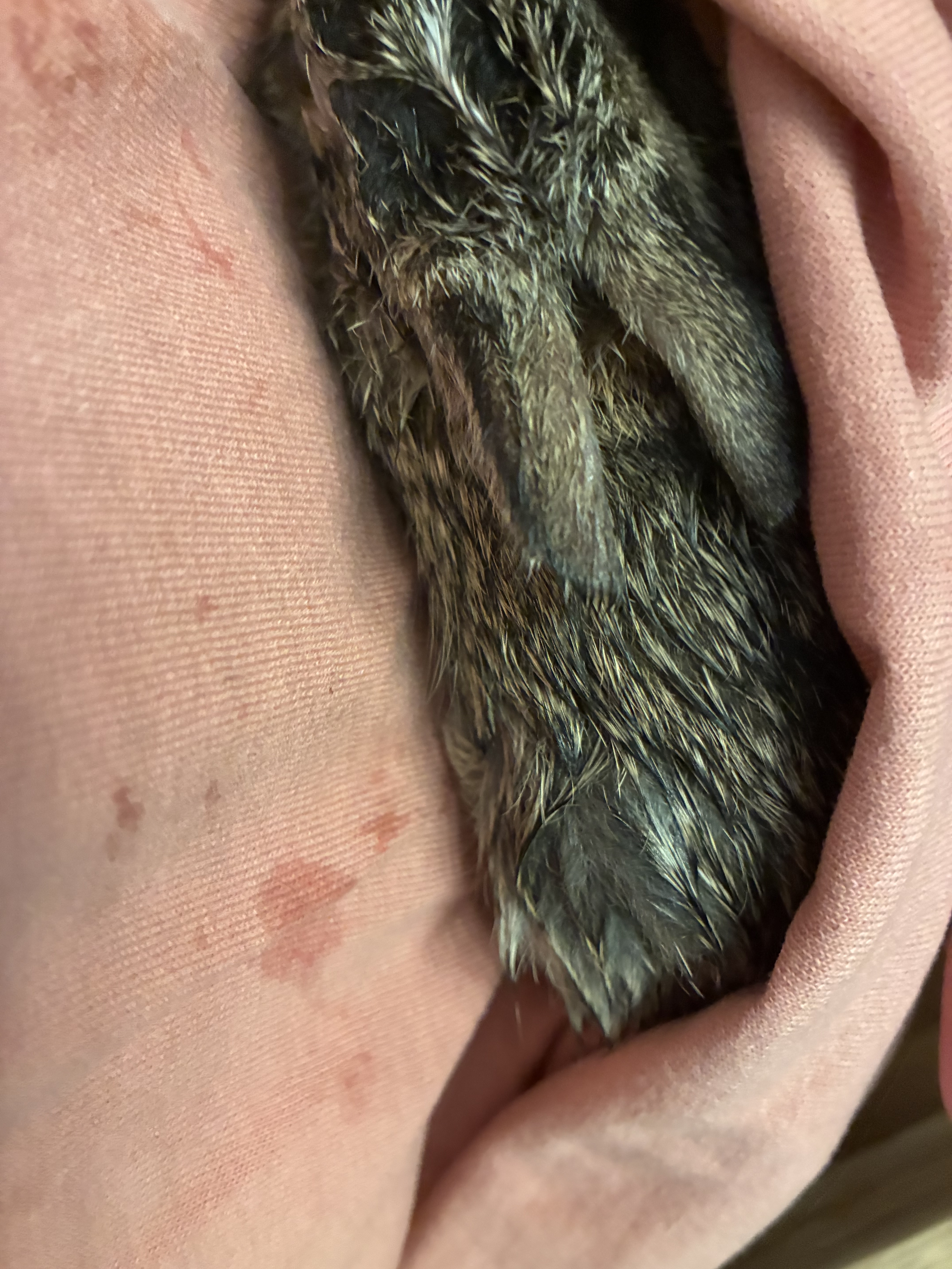 This morning this little bunny was in dog pen, I don’t know which one done it they brought to back door but they broke it’s left front leg. If it makes it through the night I guess I have to find a name for it.
